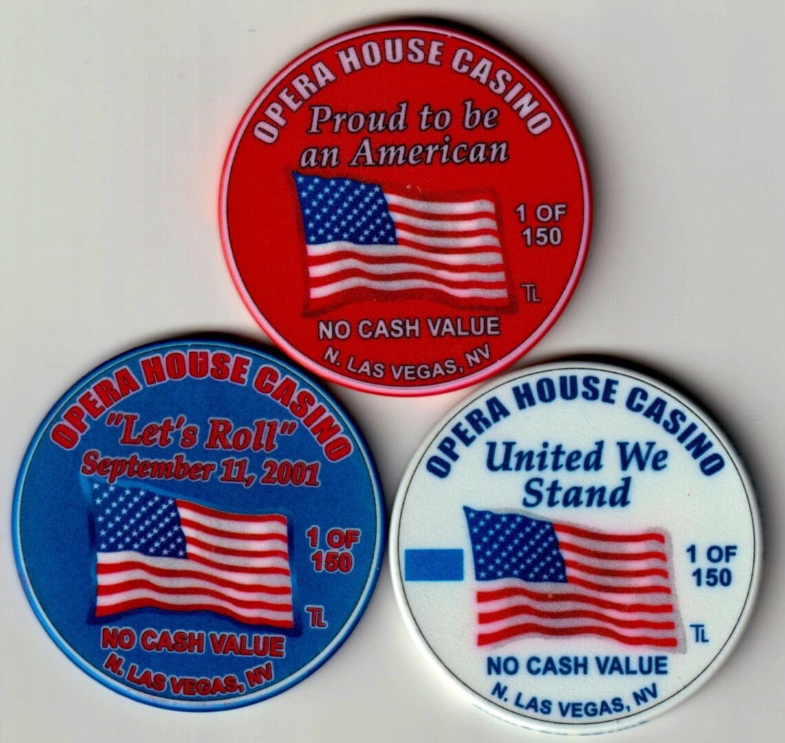 Opera House Casino (United We Stand, Proud to be American, Let’s Roll 9/11) Limited Edition Set NCV Series Chips Las Vegas, NV #5231